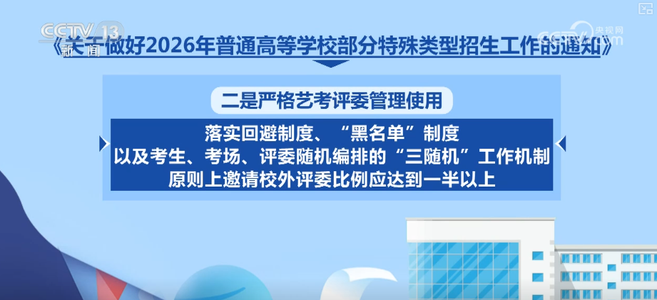 《通知》明確,一要設定考前輔導“禁區(qū)”,開展特殊類型招生的相關高校及其內設學院、教職工不得組織、參與或自行開展相關考前輔導、應試培訓。二是嚴格藝考評委管理使用,落實回避制度、“黑名單”制度,以及考生、考場、評委隨機編排的“三隨機”工作機制,原則上邀請校外評委比例應達到一半以上。三是建立藝考評委專家?guī)?,一旦發(fā)現(xiàn)評委存在可能影響考試招生公平公正行為,堅決嚴肅查處并納入“黑名單”。