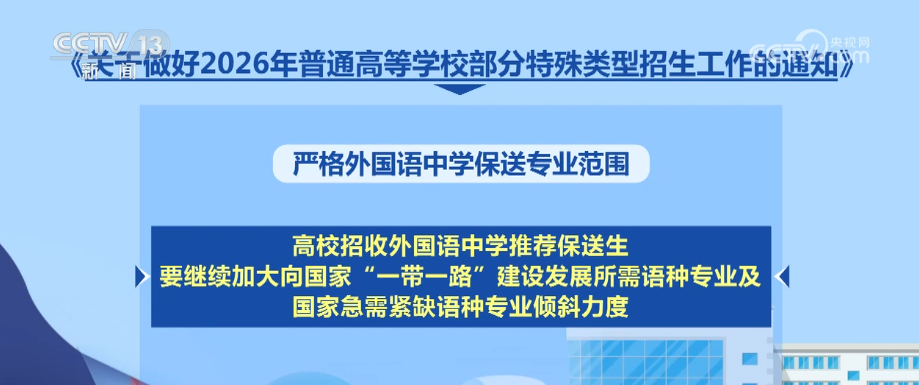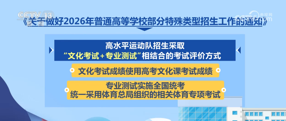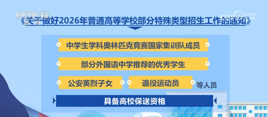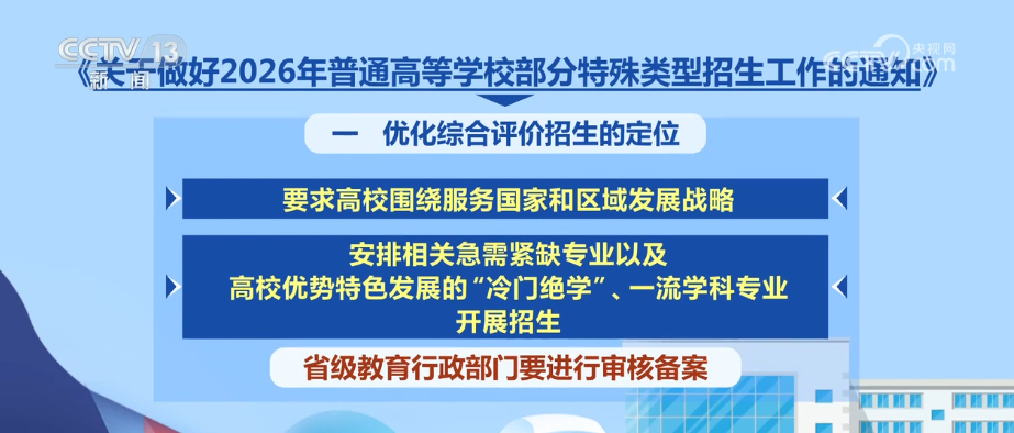 央視網(wǎng)消息:日前,教育部印發(fā)《通知》,部署做好2026年普通高校部分特殊類型招生工作。普通高校特殊類型招生主要包括藝術類專業(yè)招生、高水平運動隊招生、保送生、綜合評價招生4類。